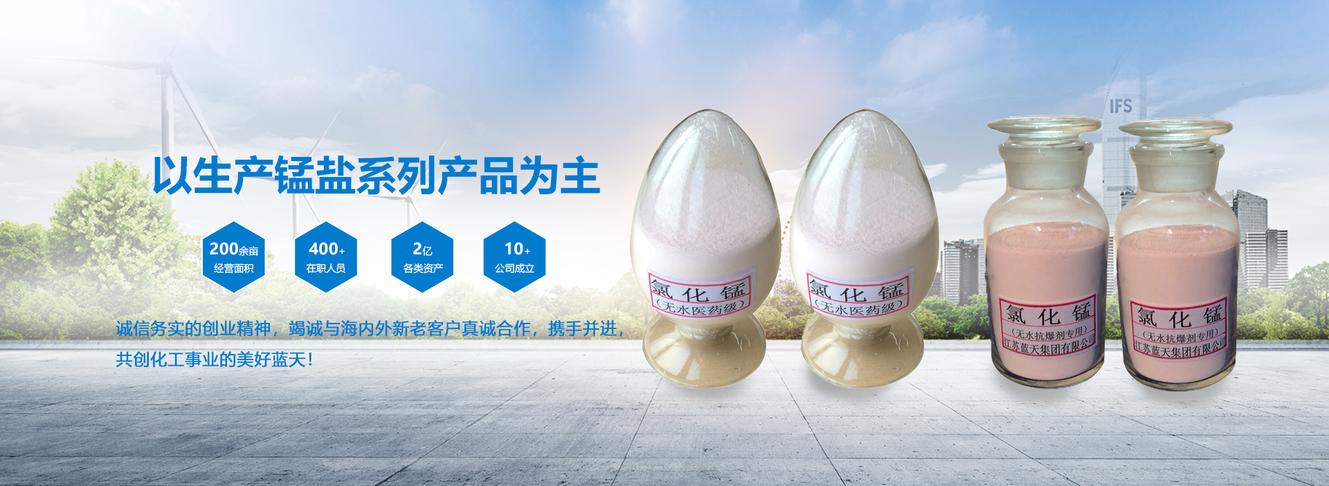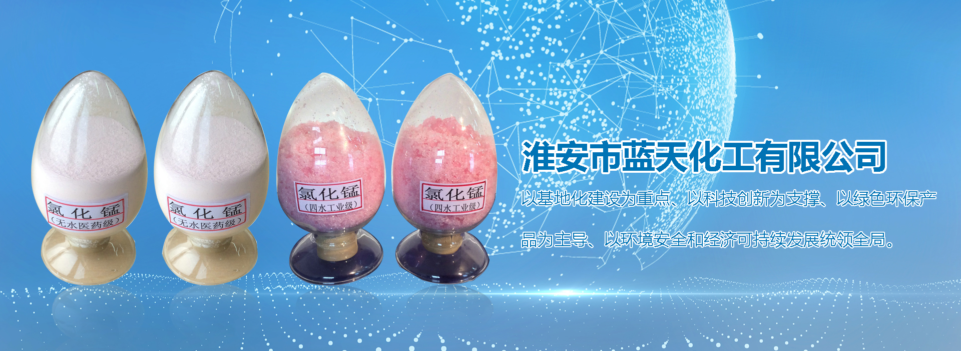 淮安市蓝天化工无限公司现具备亚洲较大的2万吨/年氯化锰出产线,以基地化扶植为重点、以科技立异为支持、以绿色环保产物为主导、以情况宁静和经济可延续成长管辖全局。寻求成长以强国、创业以兴邦,终究完成协调双盈的成长方针。